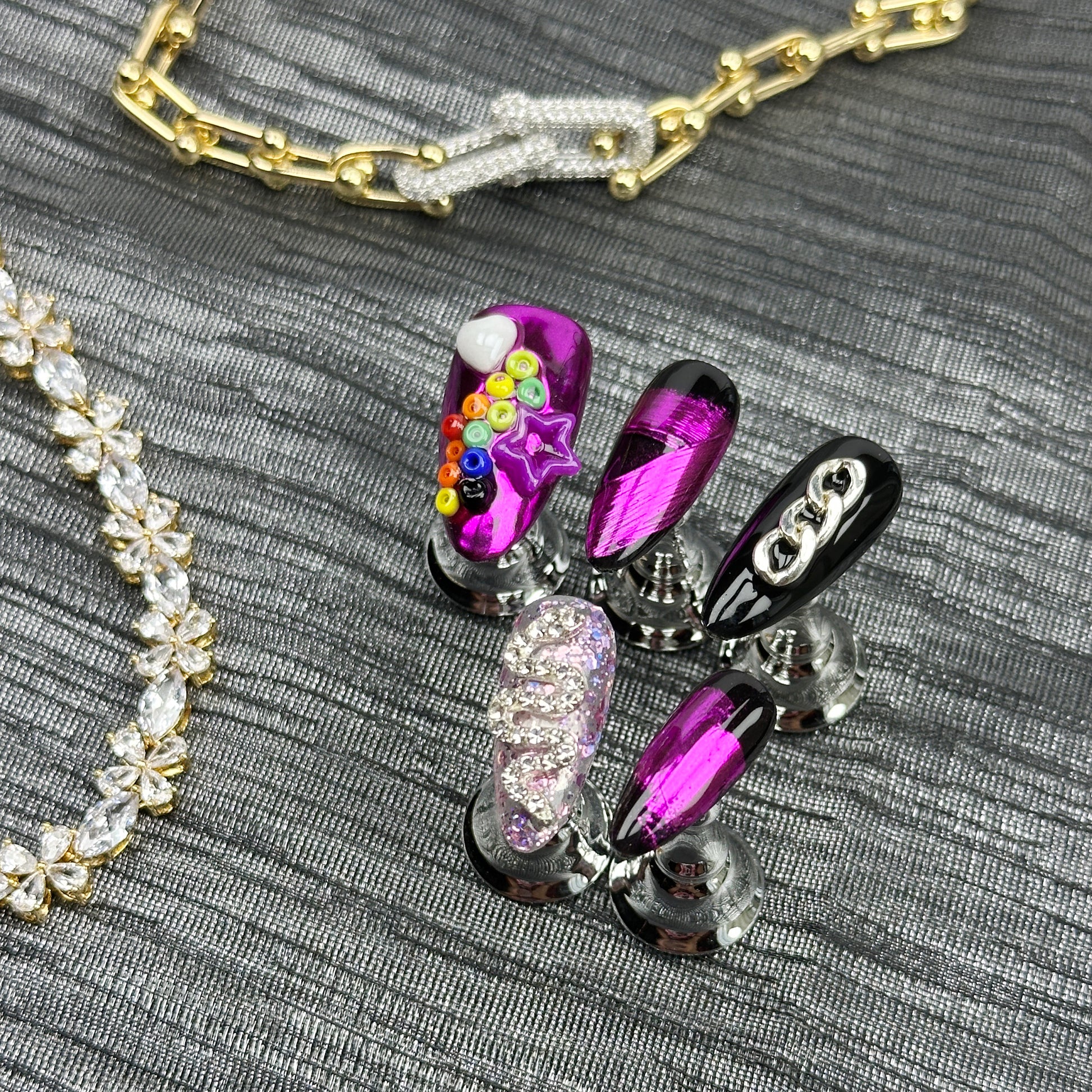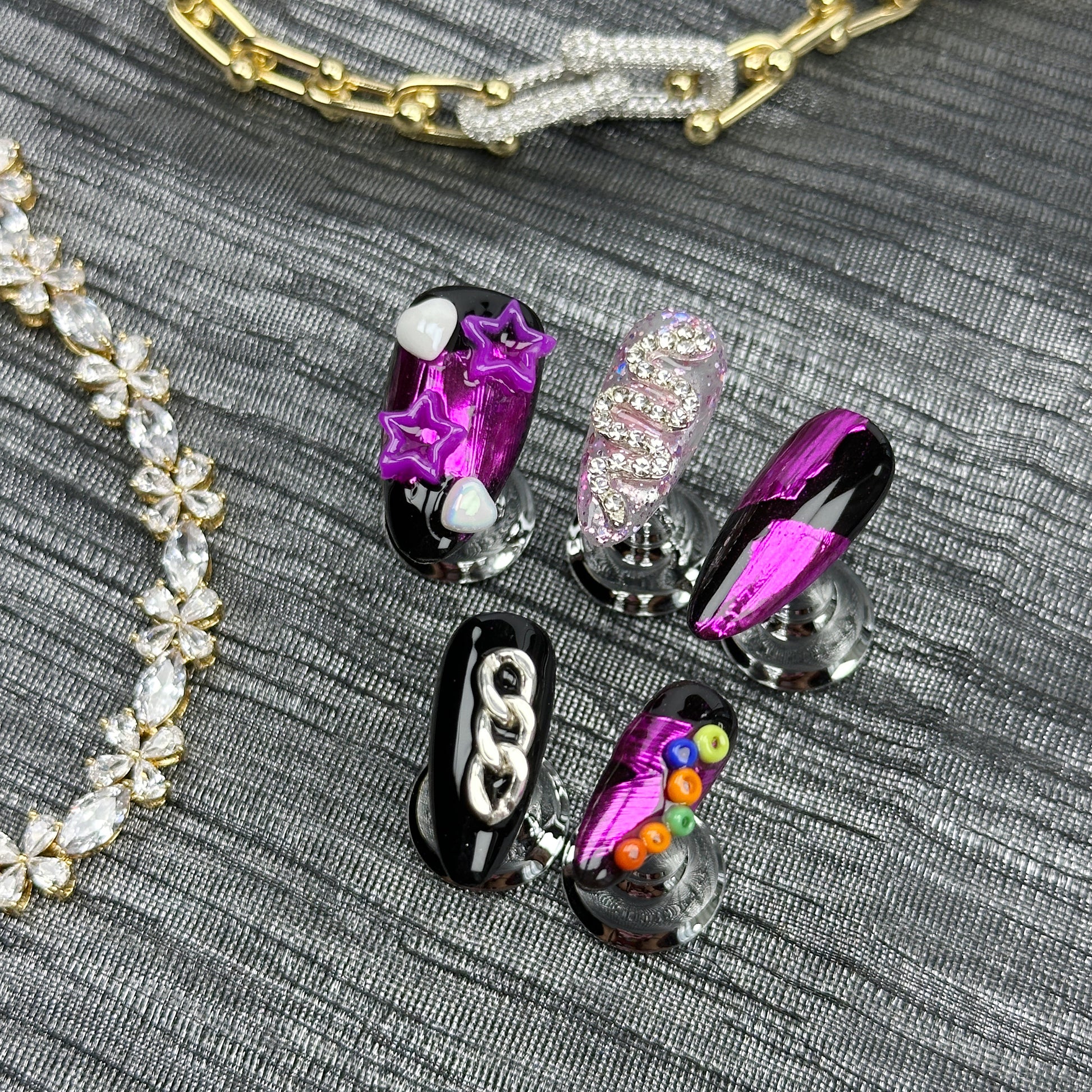 * Cyber Pop | Handmade Press-On Nails | Style No. A045 | Metallic Pink + Chains + Stars + Beads
