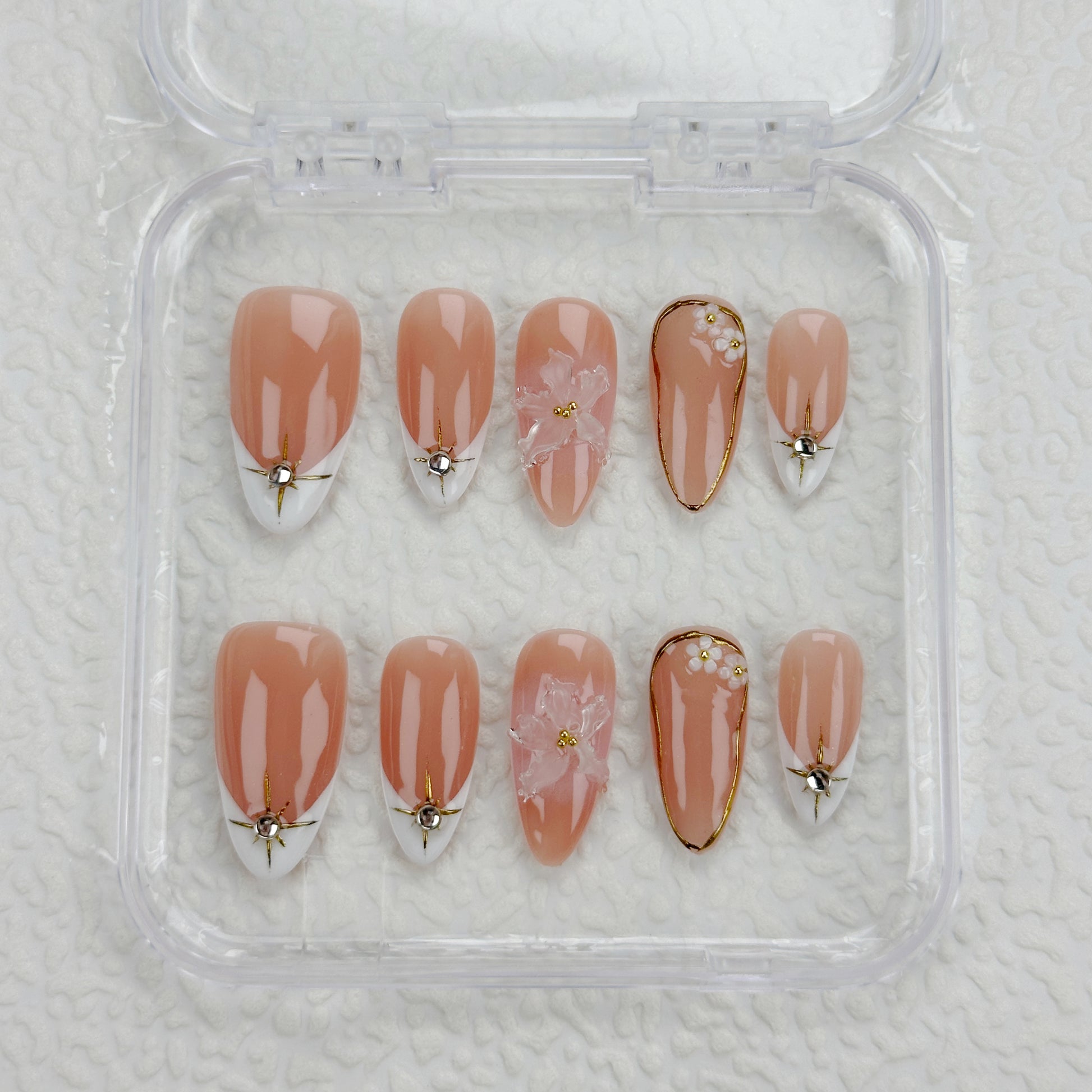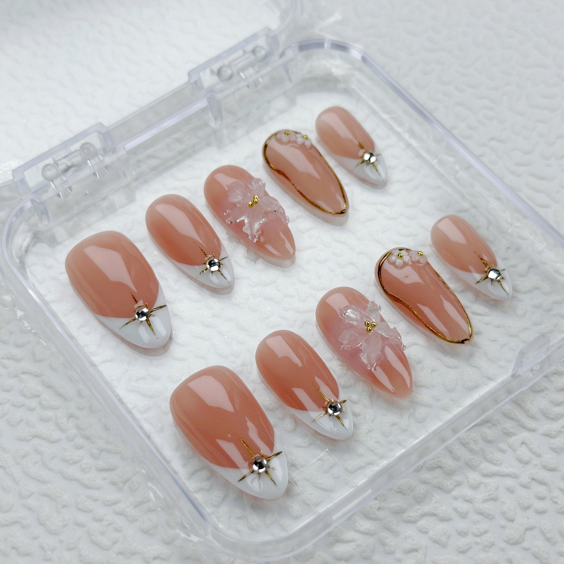 Apricot Grace | Handmade Press-On Nails | Style No. P010| Nude Apricot Base, Silver French Tips & Floral Accents, Reusable Elegant Nail Set