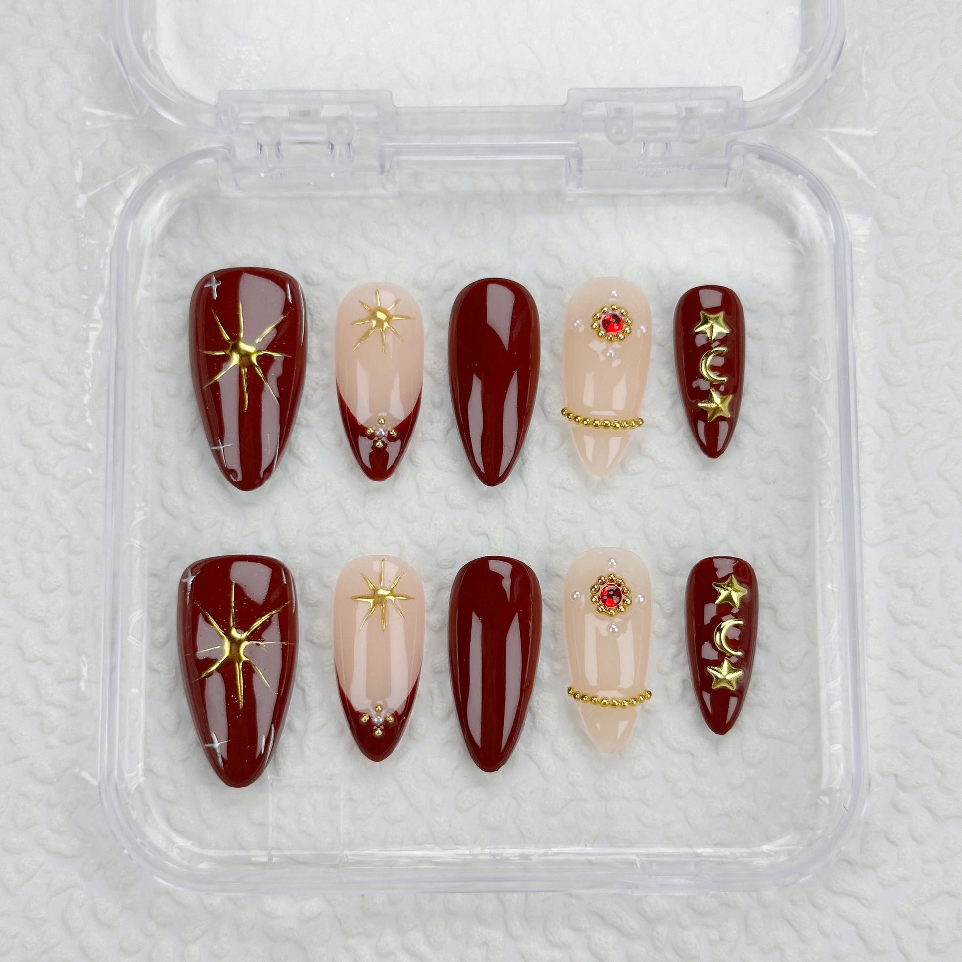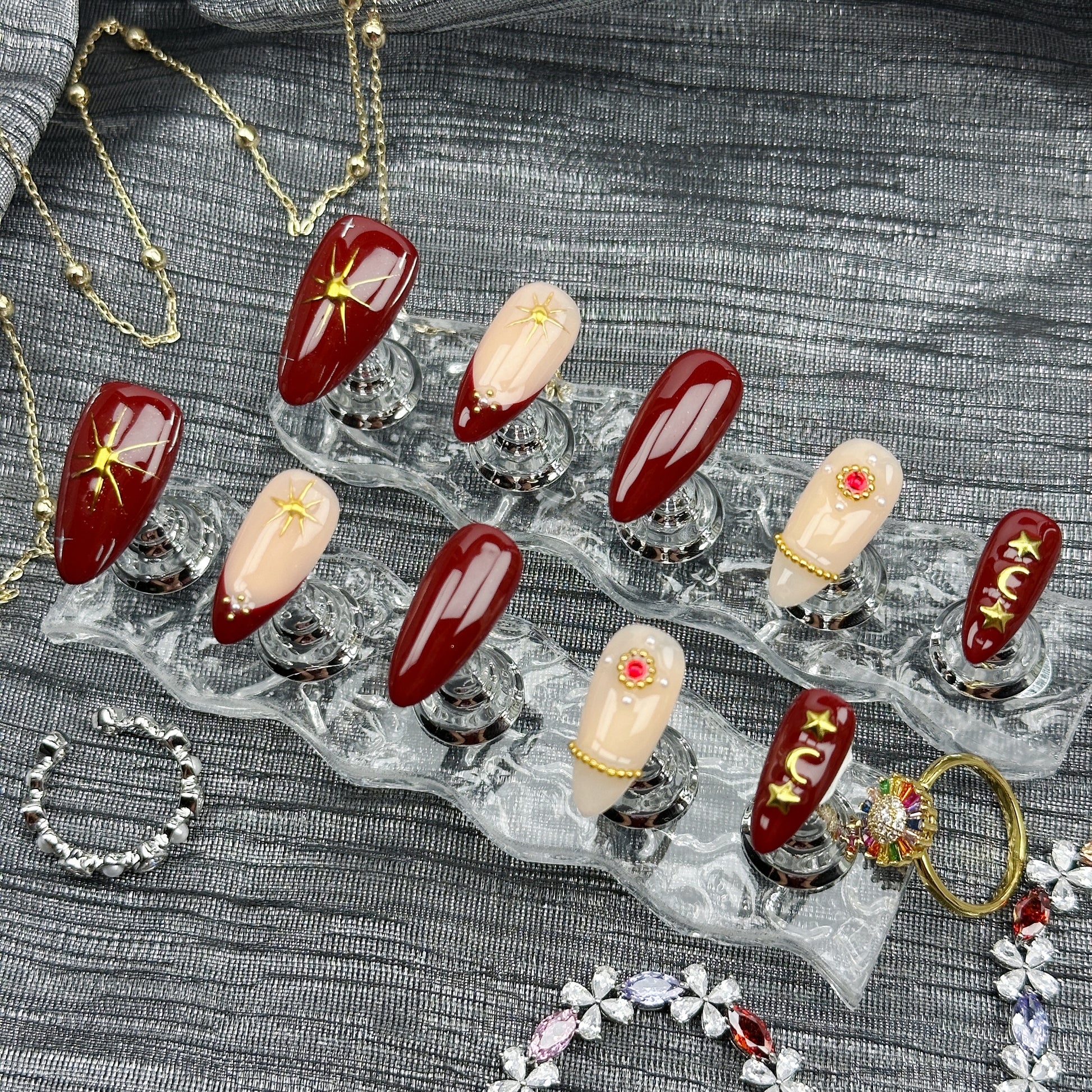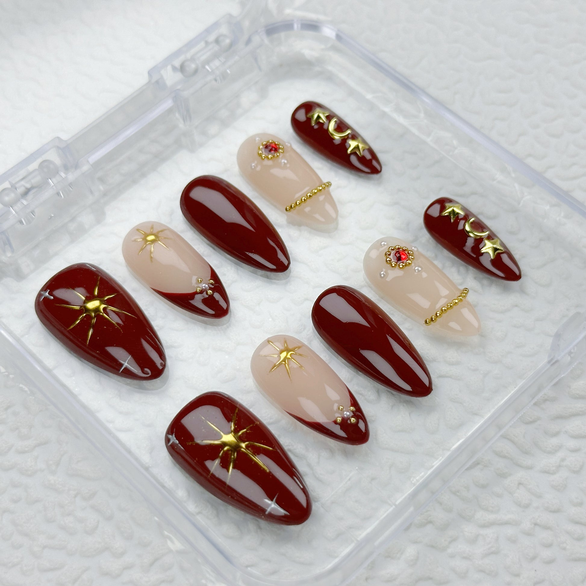 Crimson Spell | Handmade Press-On Nails | Style No. W048| Deep Red Gloss, Gold Star & Moon Charms, Reusable Elegant Gothic Nail Set