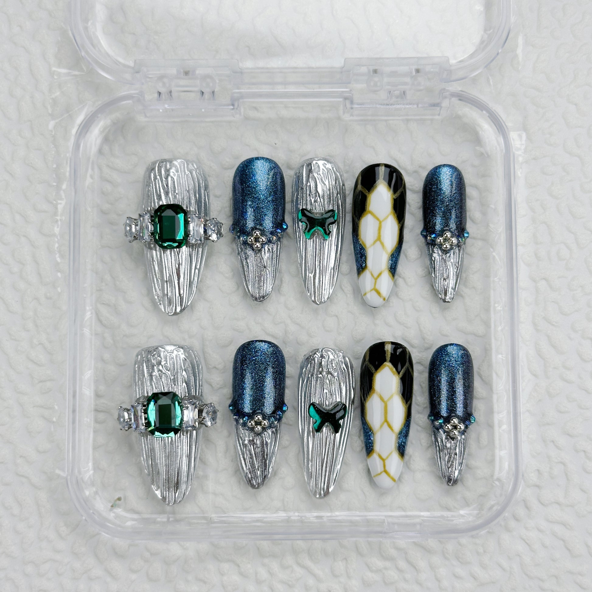 Striking and futuristic, our Cyber Serpent Press-On Nails feature sculpted silver chrome textures, deep emerald gem accents, and bold snake-patterned tips. Paired with shimmering metallic blue and black-green butterfly details, this set channels cyberpunk elegance with a reptilian edge. Perfect for fashion shoots, nightlife, or making a high-impact statement. Handmade, reusable, and easy to apply—this design turns every nail into a piece of modern armor.