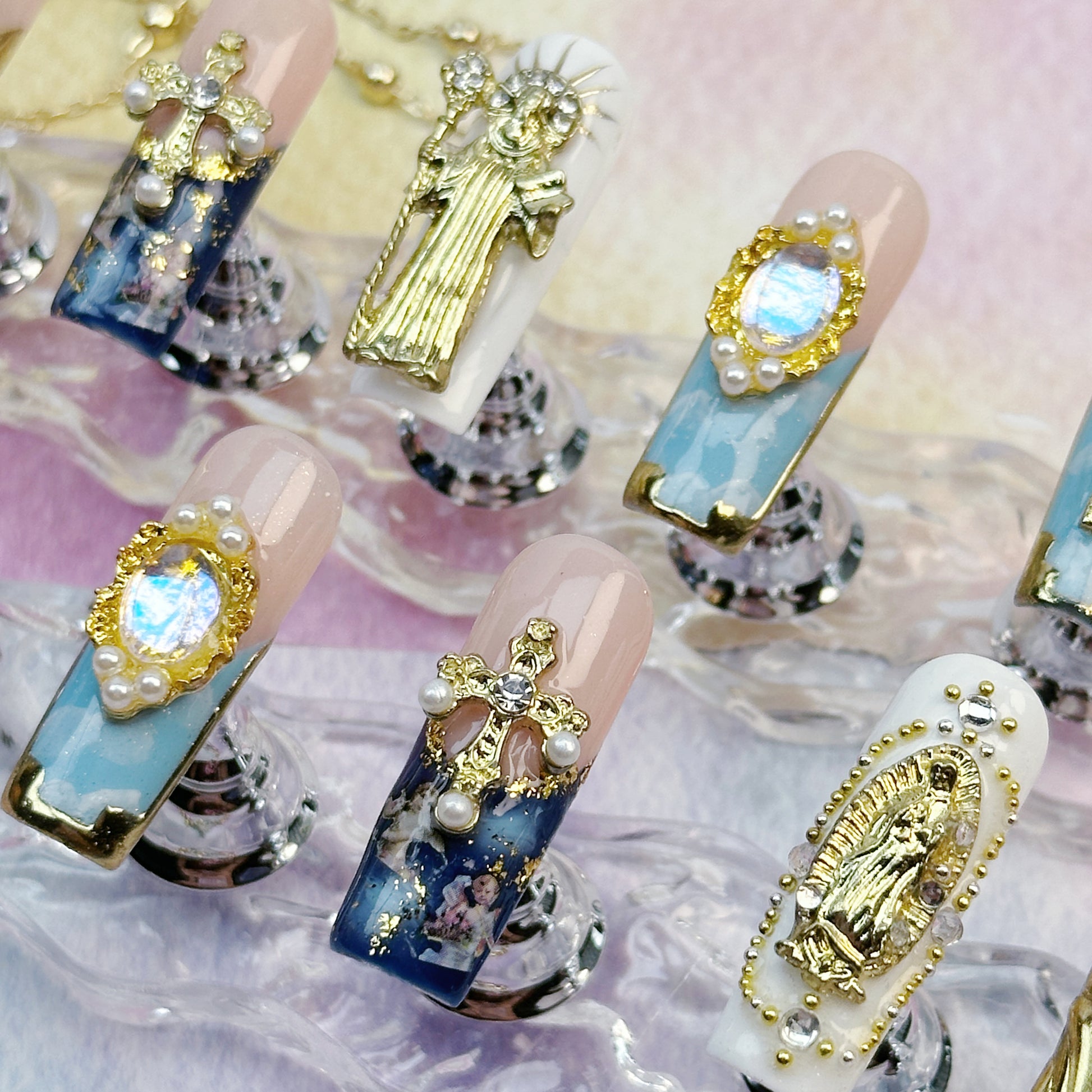 Divine Icons | Handmade Press-On Nails | Style No. A039| Gold Religious Charms, Marble Blue Base & Cross Embellishments, Reusable Statement Nail Set