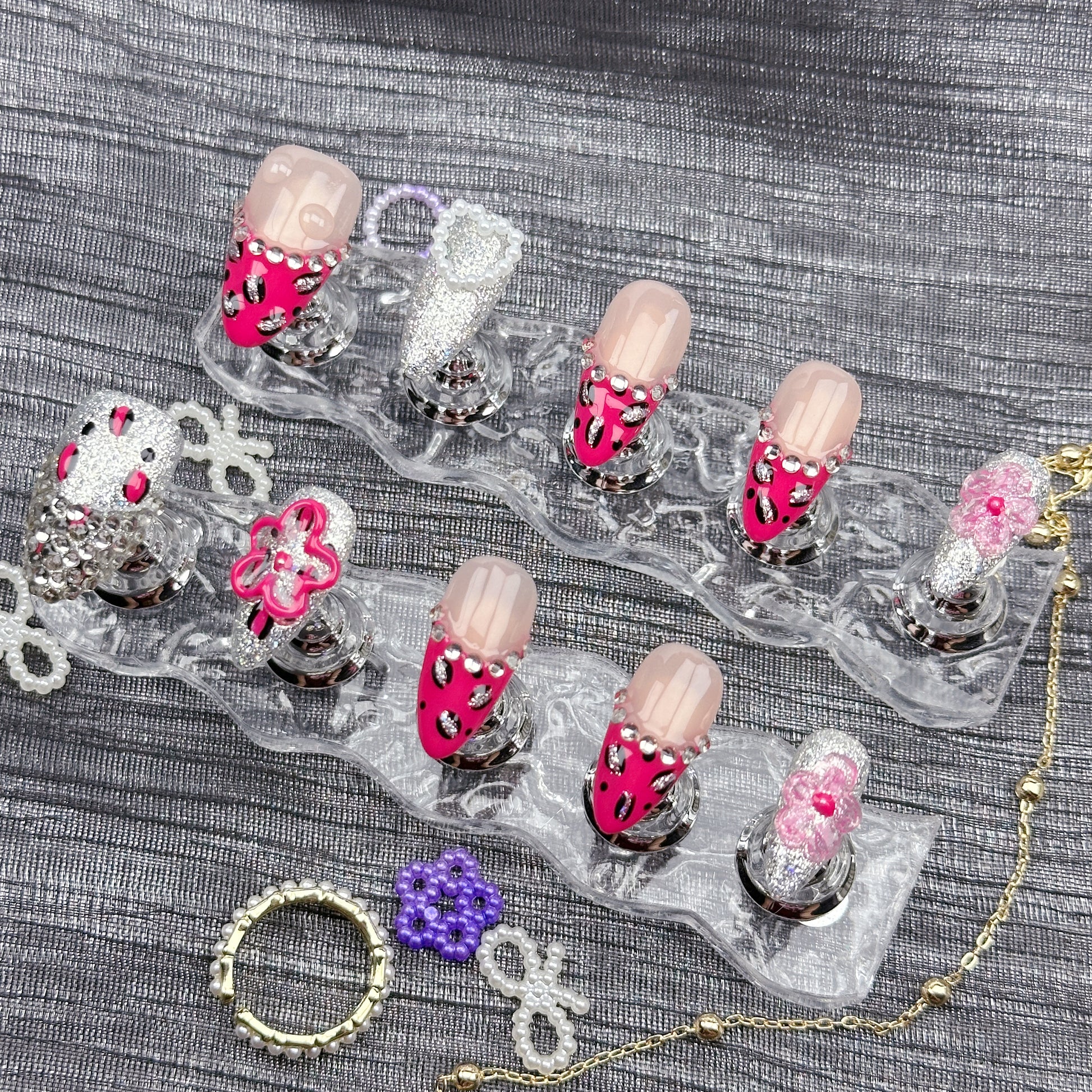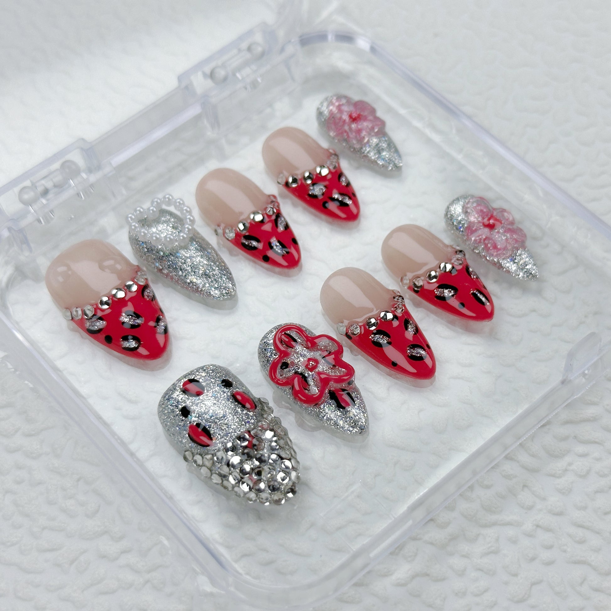 Bold and dazzling, our Fierce Spark Press-On Nails combine fierce red-and-black leopard print with glittering silver tips and 3D gem details. Featuring sparkling rhinestones and playful floral accents, this handmade set is perfect for parties, performances, or confident everyday glam. Reusable, lightweight, and easy to apply—these nails are made to roar with sparkle and attitude at every turn.