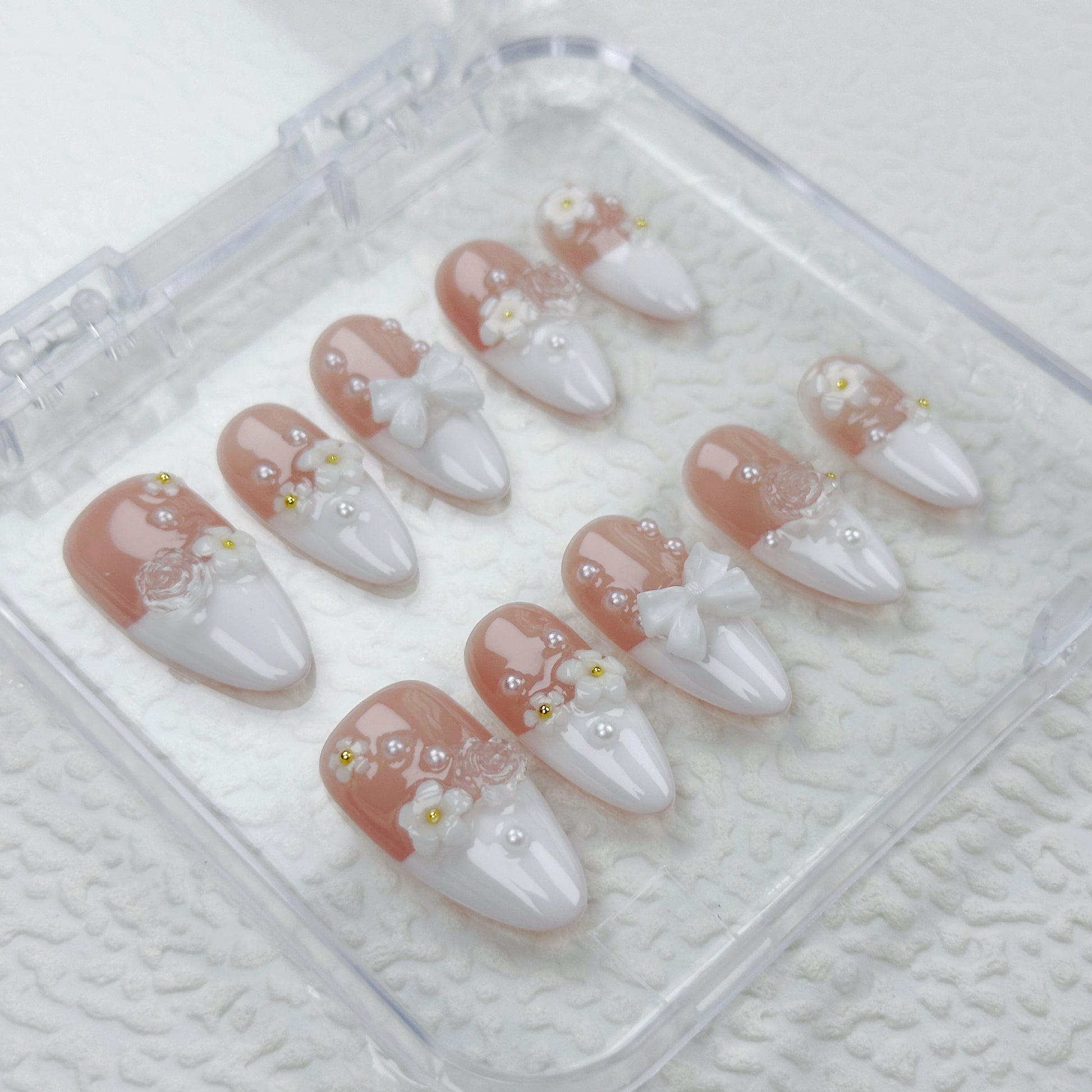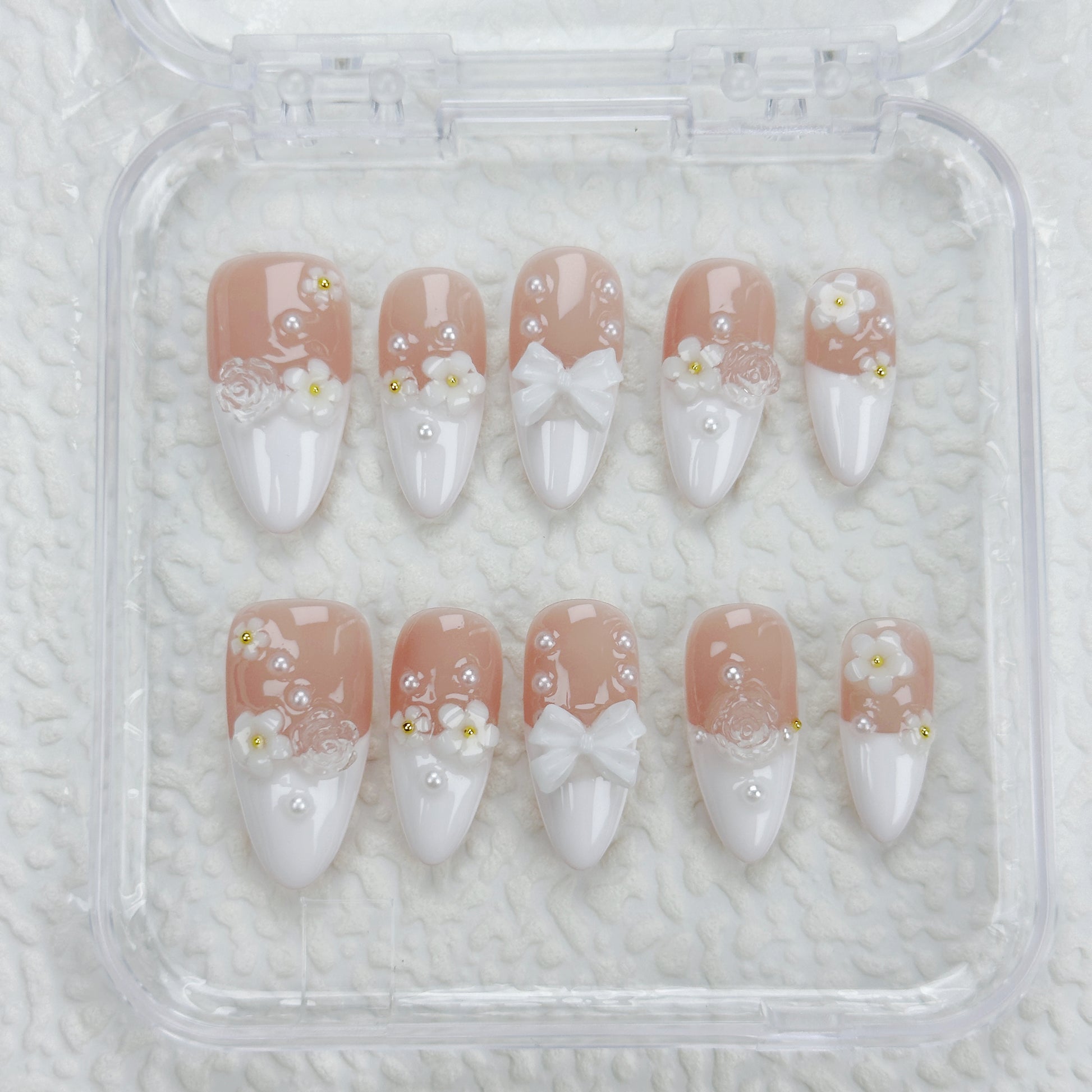 Daisy Lace | Handmade Press-On Nails | Style No. A017 | French Tip, 3D Flowers & Bow Accents, Reusable Nail Set
