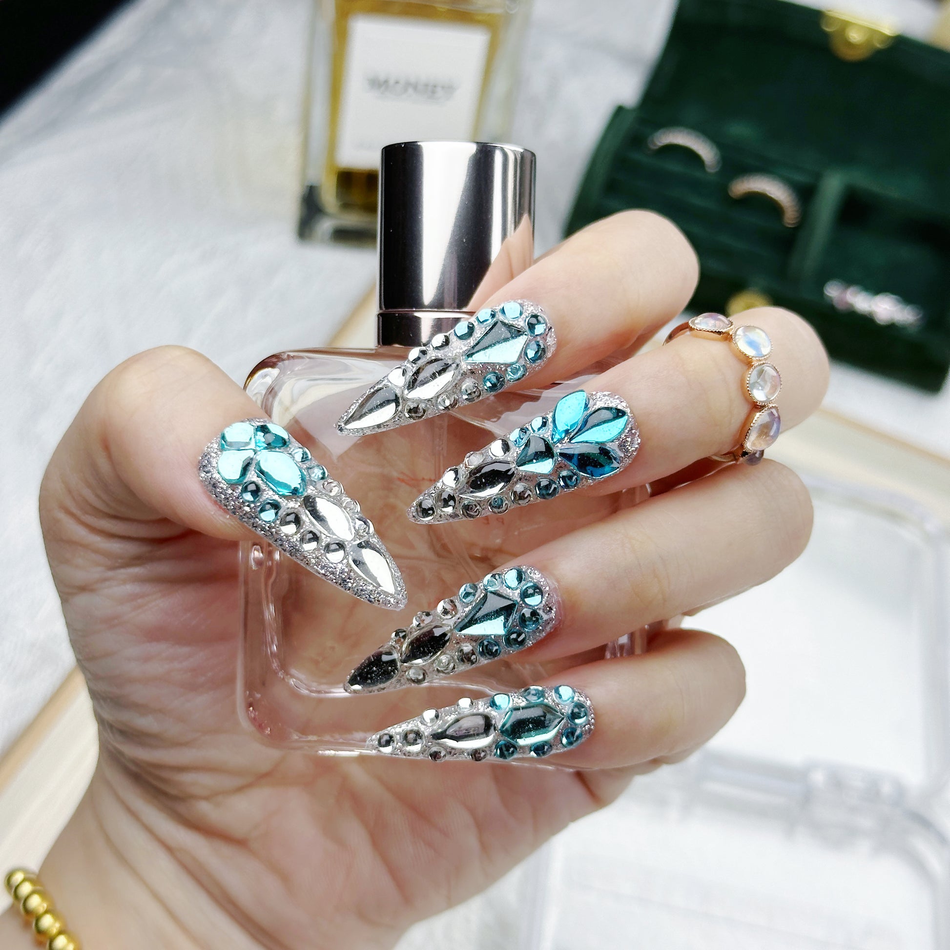 Crystal Ice Queen | Handmade Press-On Nails | Style No. A005 | Icy Blue Rhinestones, Silver Chrome Accents