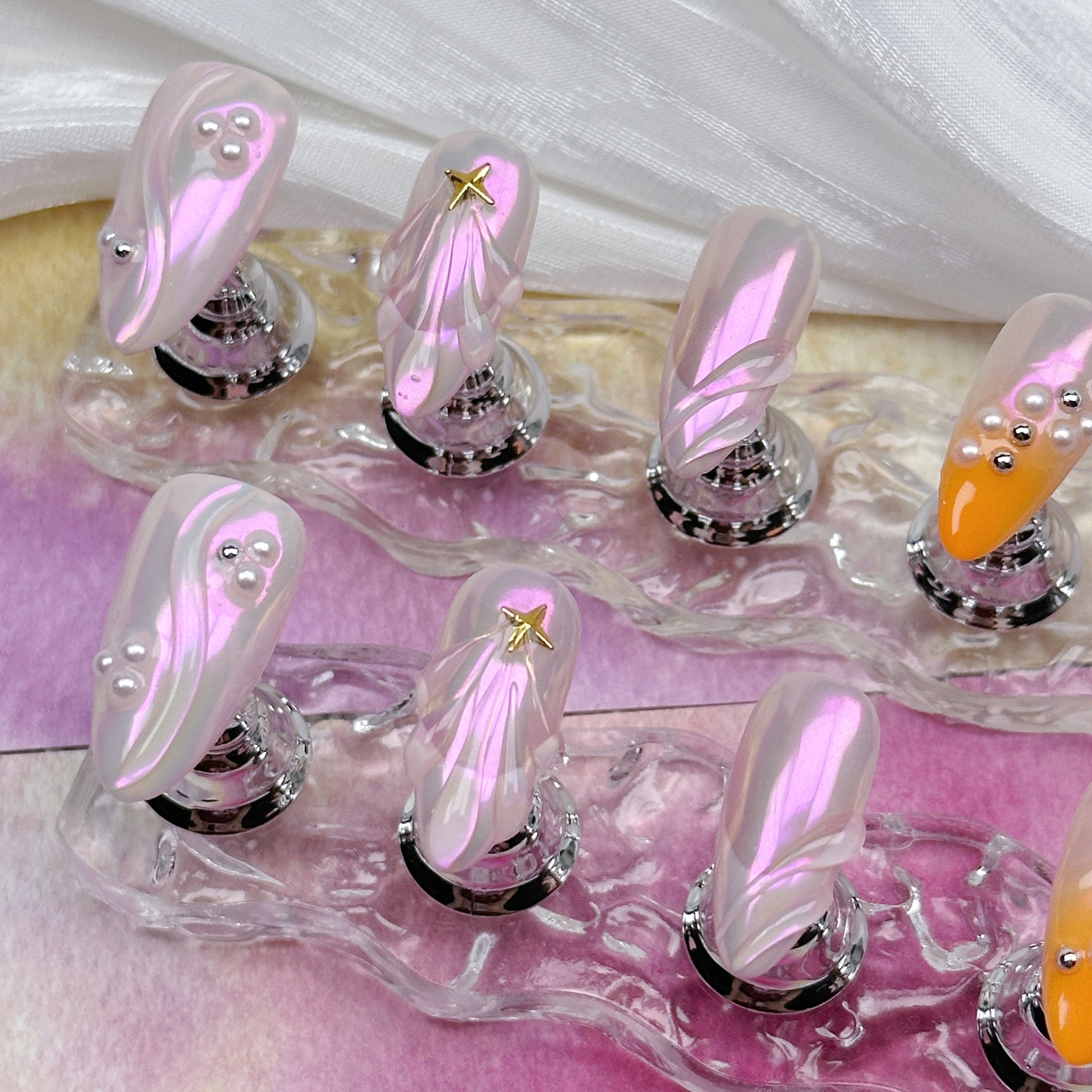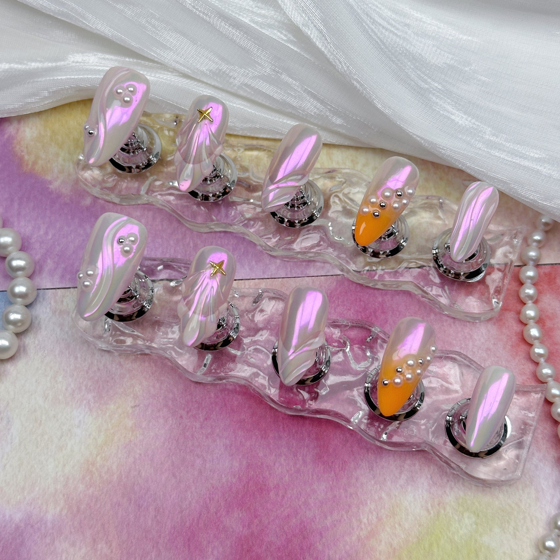 Shine from every angle with our Pink Aurora Press-On Nails. This handmade set features a mesmerizing iridescent pink chrome finish with wavy textures, silver studs, and star charms. A pop of vibrant orange adds a playful twist to the dreamy design. Perfect for parties, night outs, or adding a bold yet elegant vibe to any outfit. Lightweight, reusable, and easy to apply—these nails are your shortcut to instant glam.