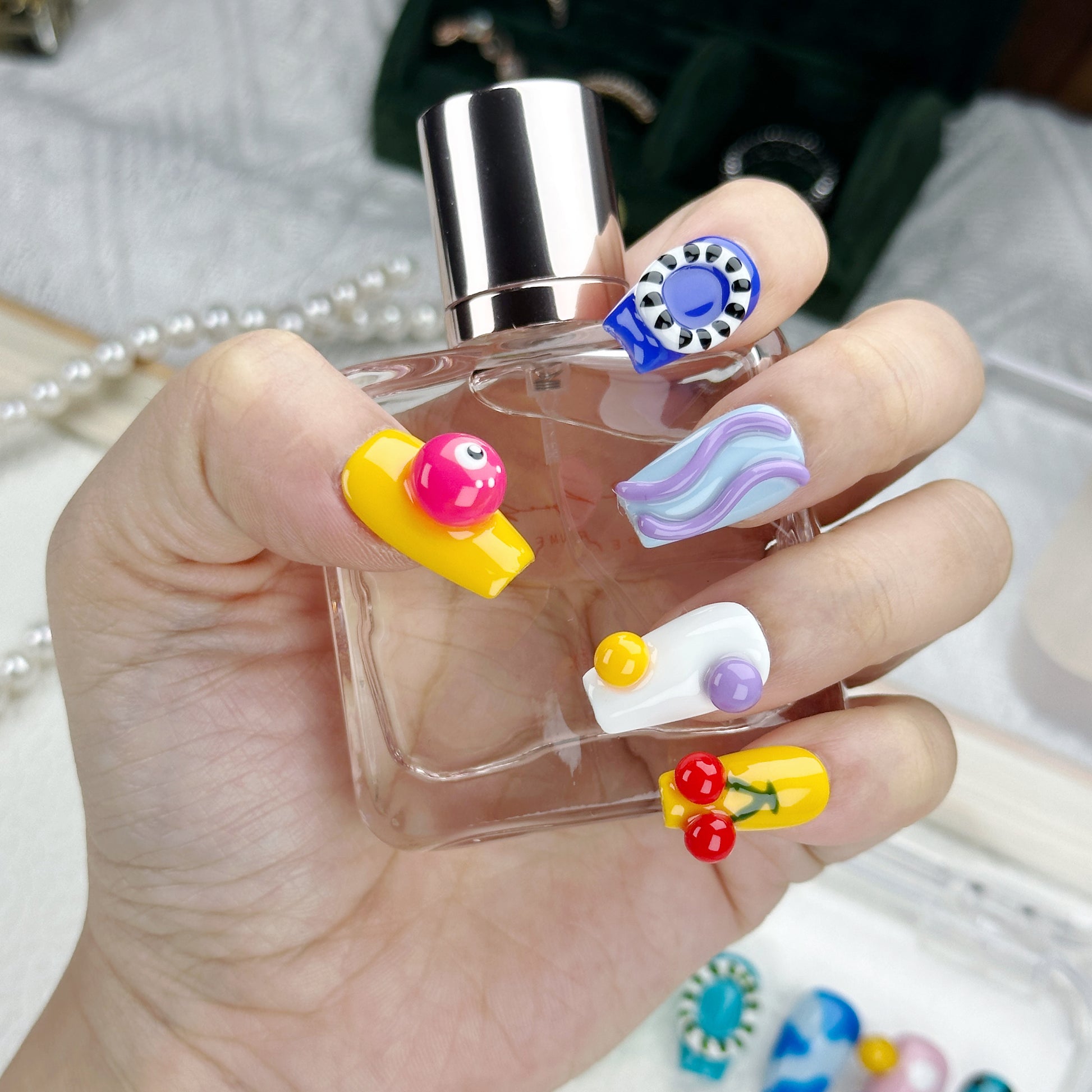 Candyland Dreams | Handmade Press-On Nails | Style No. L025| Colorful Abstract Icons, 3D Cartoon Charms, Reusable Artistic Nail Set
