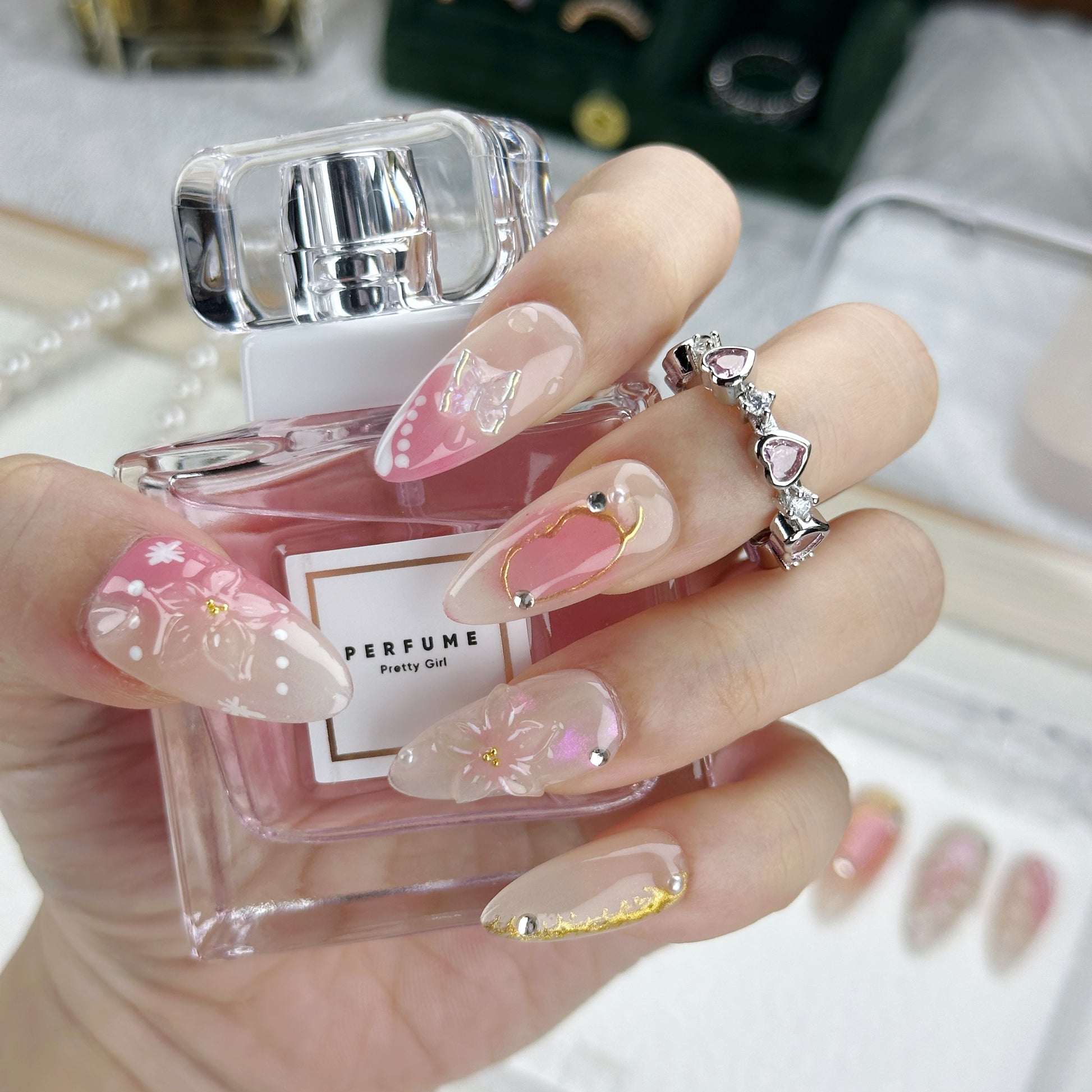 Sakura Whisper | Handmade Press-On Nails | Style No. P059 | Nude & Pink Blossom Design, Gold Foil Accents, Reusable Floral Nail Set