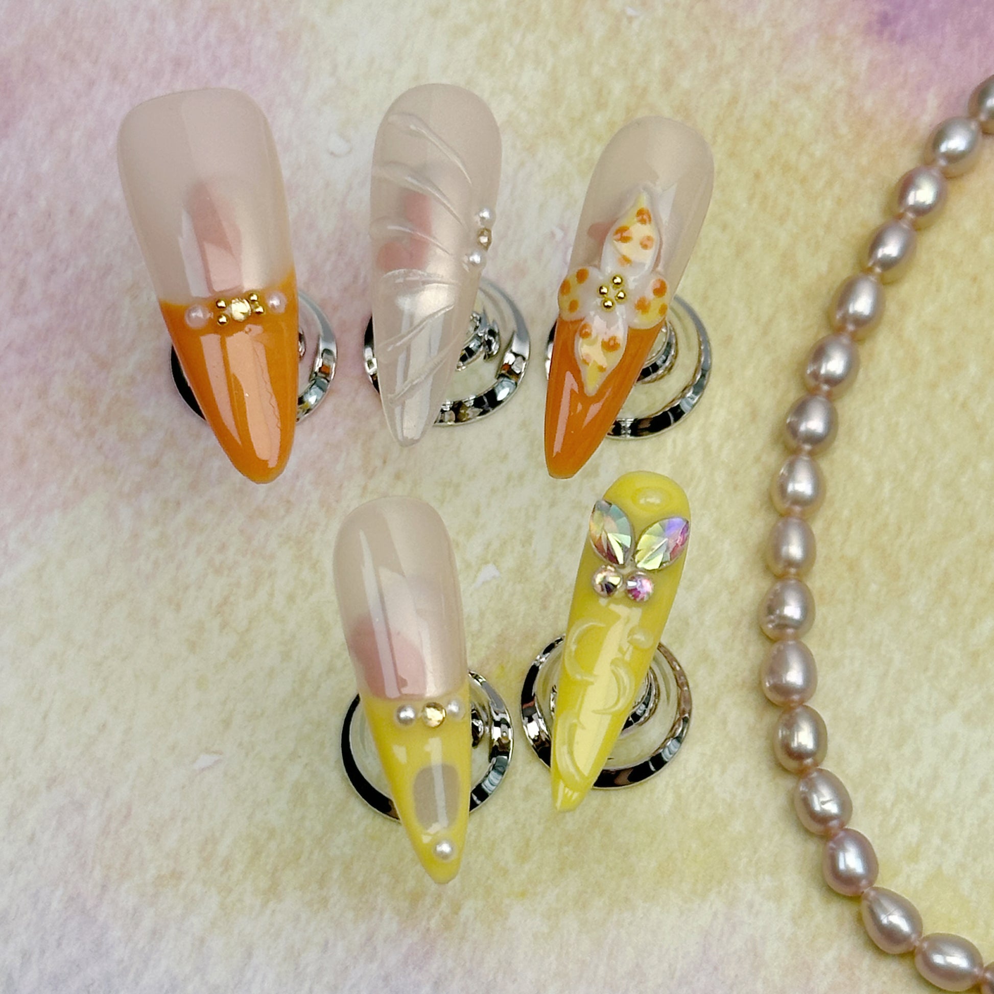 Fresh and full of energy, our Citrus Bloom Press-On Nails combine vibrant orange and lemon-yellow French tips with delicate floral prints, crystal butterflies, and gold bead accents. The design evokes sunshine, blossoms, and juicy fruit vibes—perfect for summer days, spring looks, or adding brightness to your daily style. Handmade, lightweight, and reusable, these nails are an easy way to get salon-worthy charm in minutes.